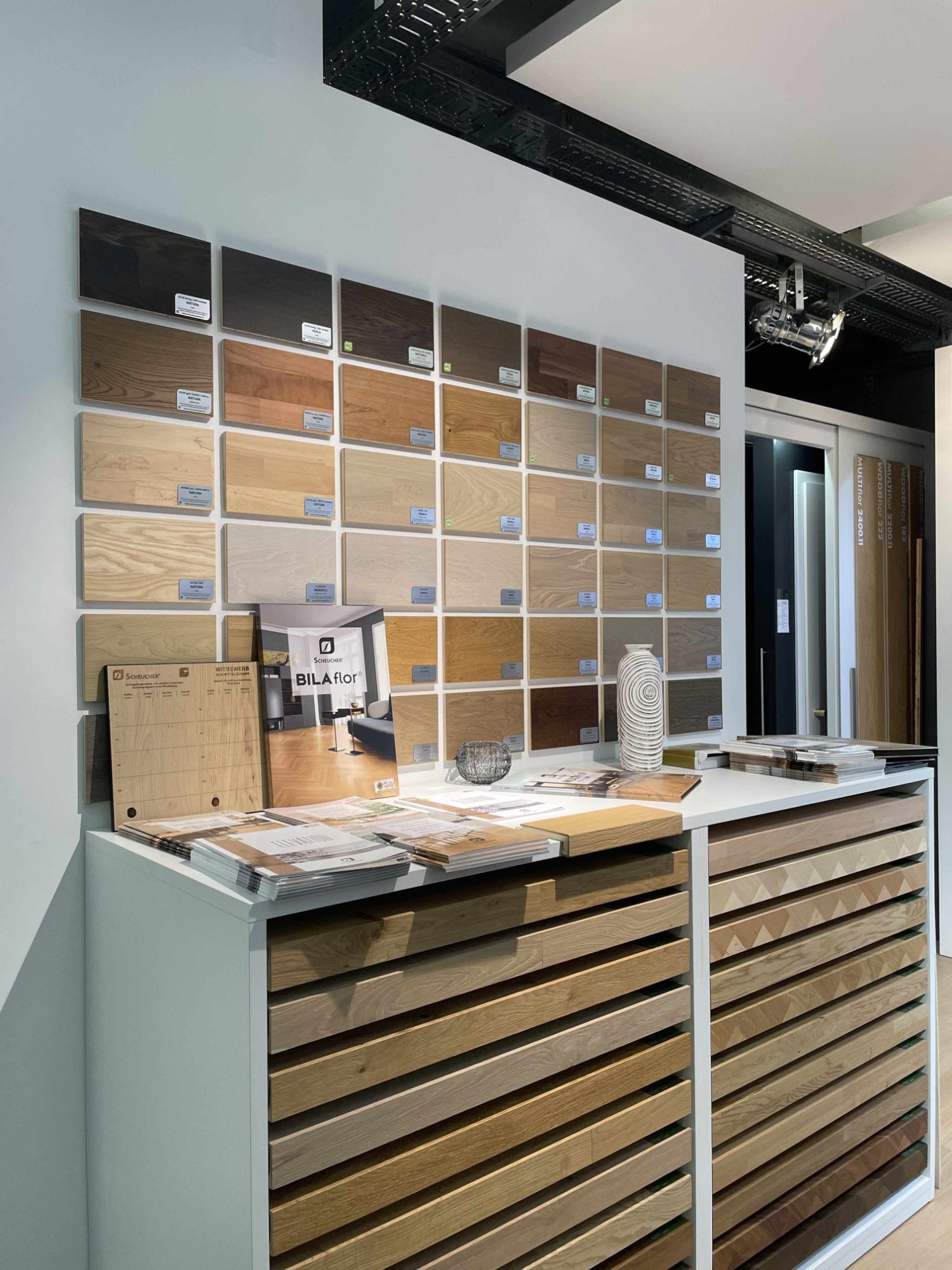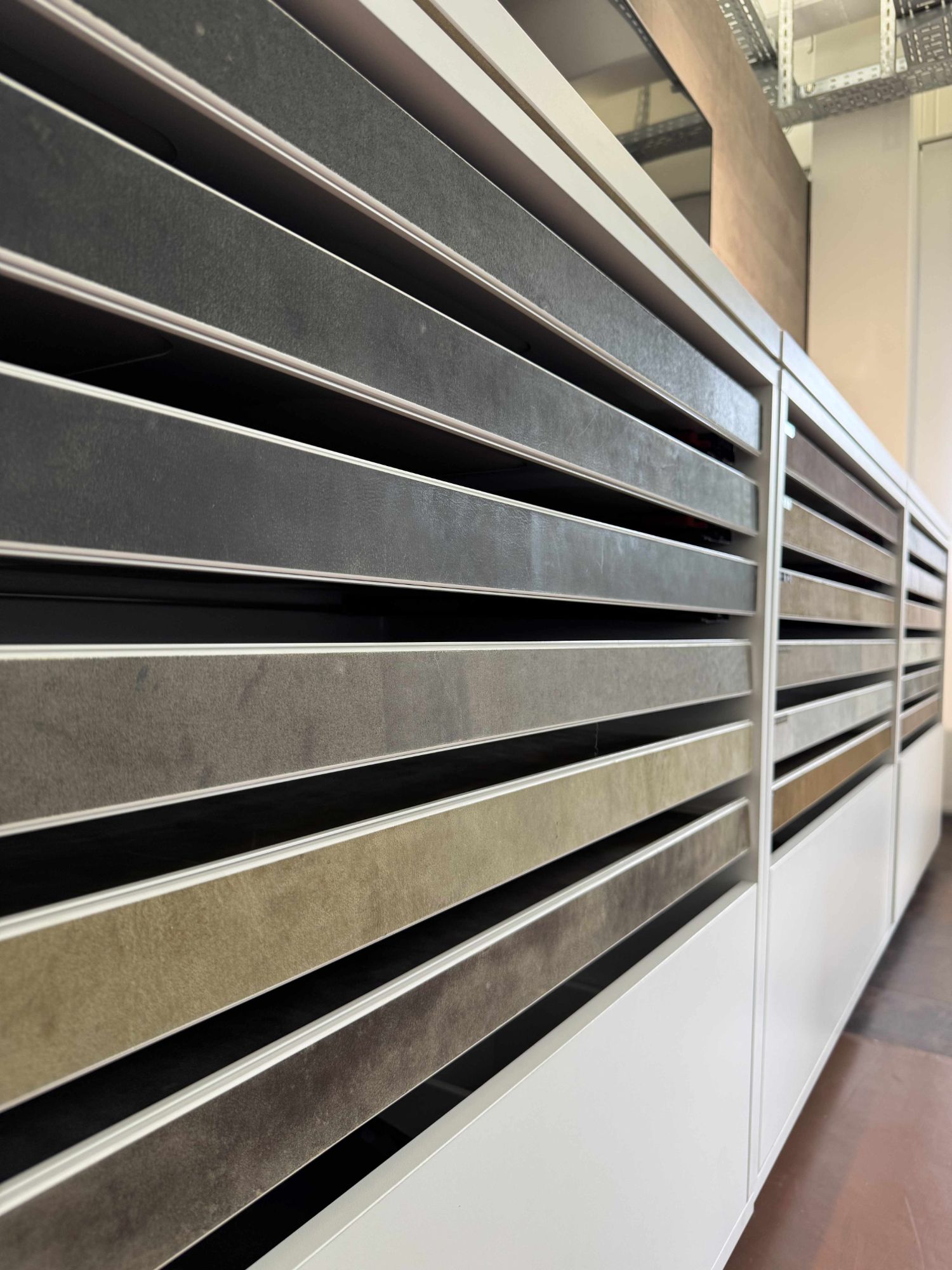 Auf einer Fläche von 600 m² zeigen wir unser gesamtes Programm – von Vinyl, Parkett, Laminat und Leder über Wandverkleidungen bis hin zu keramischen Fliesen. Hier finden Sie garantiert das passende Material für Ihr Projekt.